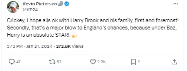 केविन पीटरसन ने अपने एक्स अकाउंट से ट्वीट करते हुए लिखा,” सबसे पहली और सबसे महत्वपूर्ण बात यह है कि मुझे आशा है कि सबसे हैरी ब्रुक और उसके परिवार के साथ सबकुछ ठीक है. दूसरी यह कि हैरी के बाहर होने के बाद इंग्लैंड की उम्मीदें थोड़ी खत्म हो गई है. क्योंकि बैजबॉल में हैरी ब्रूक एक शानदार स्टार हैं.” बता दें कि हैरी ने इंग्लैंड के लिए अब तक 12 टेस्ट मैचों की 20 इनिंग्स में 62 के औसत से रन बनाए हैं. उन्होंने अब तक कुल 1181 रन बनाए हैं. स्ट्राइक रेट करीब 91 का रहा है. 4 शतक भी लगा चुके हैं.