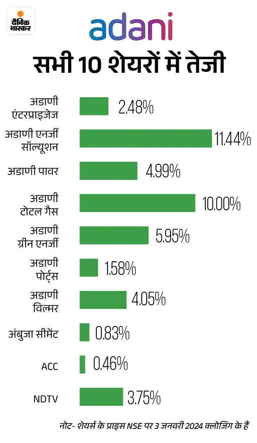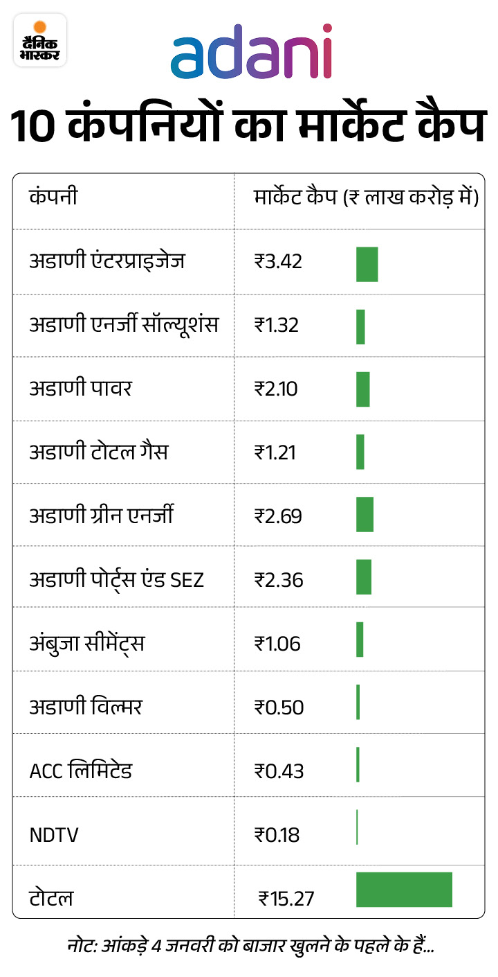कल यानी बुधवार 3 जनवरी को अडाणी ग्रुप की कंपनियों ने ₹64,500 करोड़ की कमाई की है। इससे ग्रुप का टोटल मार्केट कैप ₹14.47 लाख करोड़ से बढ़कर ₹15.27 लाख करोड़ हो गया है। अडाणी ग्रुप रिलायंस इंडस्ट्रीज लिमिटेड के बाद देश का दूसरा सबसे वैल्युएबल ग्रुप है। मुकेश अंबानी के रिलायंस इंडस्ट्री का टोटल मार्केट कैप ₹17.48 लाख करोड़ है।