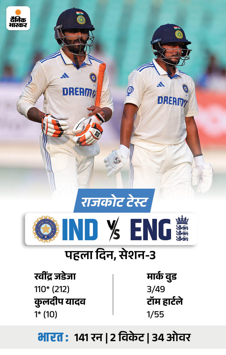 कप्तान रोहित शर्मा और रवींद्र जडेजा की शतकीय पारियों के दम पर भारत ने इंग्लैंड के खिलाफ तीसरे टेस्ट मैच के पहले दिन 5 विकेट खोकर 326 रन बनाए। स्टंप्स तक रवींद्र जडेजा 110 और कुलदीप यादव 1 रन बनाकर नॉटआउट रहे। इंग्लैंड के लिए तेज गेंदबाज मार्क वुड ने तीन विकेट लिए। रोहित और जडेजा ने चौथे विकेट के लिए 204 रन की पार्टनरशिप की। यह इस सीरीज में भारत की ओर से हुई पहली सेंचुरी पार्टनरशिप है।
