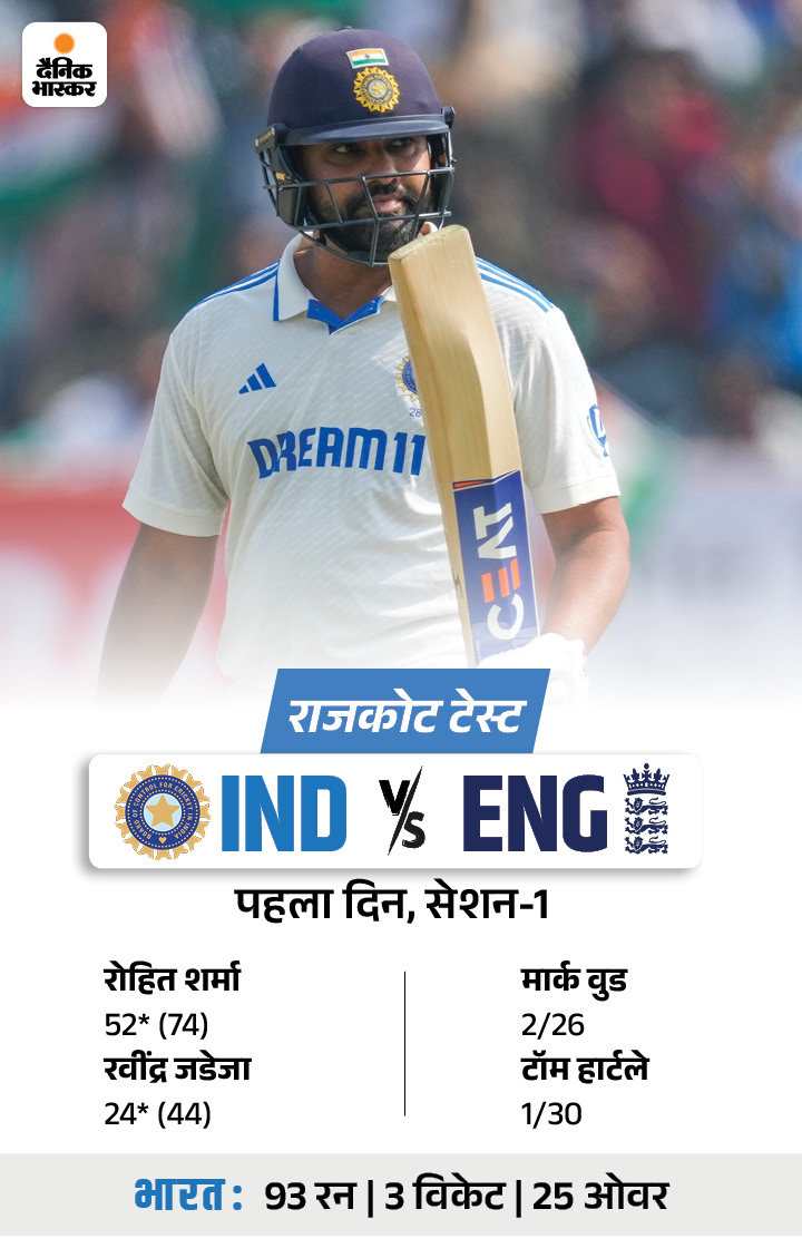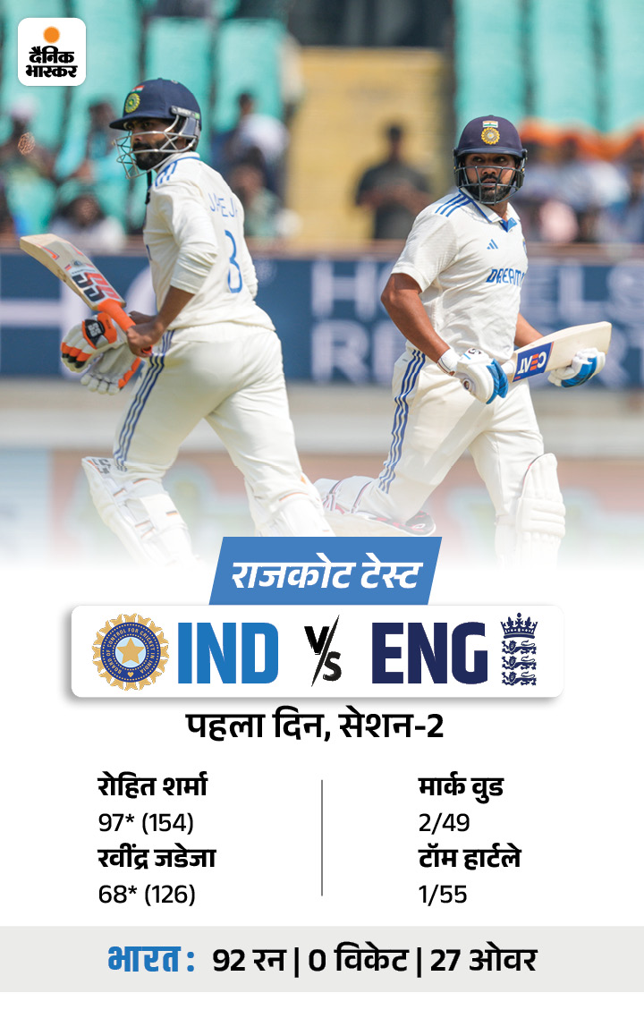 सेशन खत्म होने तक टीम का स्कोर 185/3 रहा। रोहित 97 और जडेजा 68 रन बनाकर नॉटआउट लौटे। सेशन में भारत ने 92 रन बनाए और एक भी विकेट नहीं गंवाया। इस सीरीज में पहली बार ऐसा हुआ, जब किसी सेशन में कोई विकेट नहीं गिरा।