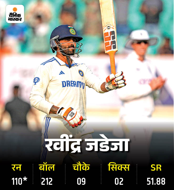 दूसरी ओर रवींद्र जडेजा ने करियर का चौथा टेस्ट शतक जमाया। वे अपनी पारी में अब तक 212 गेंदों का सामना करते हुए 9 चौके और 2 छक्के जमा चुके हैं।