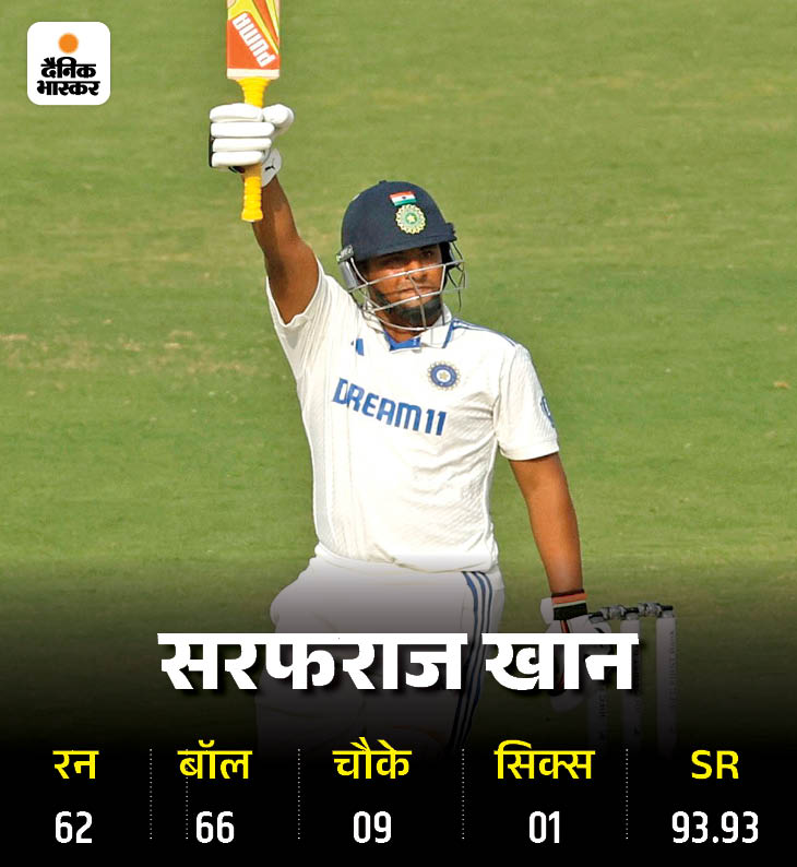 टीम इंडिया के लिए अपना डेब्यू टेस्ट खेल रहे सरफराज खान ने 48 बॉल पर अर्धशतक लगाया। उन्होंने 66 बॉल पर 62 रन की पारी खेली। यह उनके इंटरनेशनल करियर की पहली फिफ्टी रही।