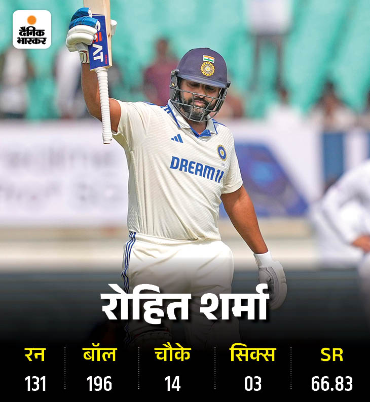 रोहित ने करियर का 11वां टेस्ट शतक जमाया। वे 196 गेंदों पर 14 चौके और 3 छक्के की मदद से 131 रन बनाकर आउट हुए। मार्क वुड ने उन्हें बेन स्टोक्स के हाथों कैच कराया। वुड ने इससे पहले जायसवाल और गिल का विकेट भी लिया था।