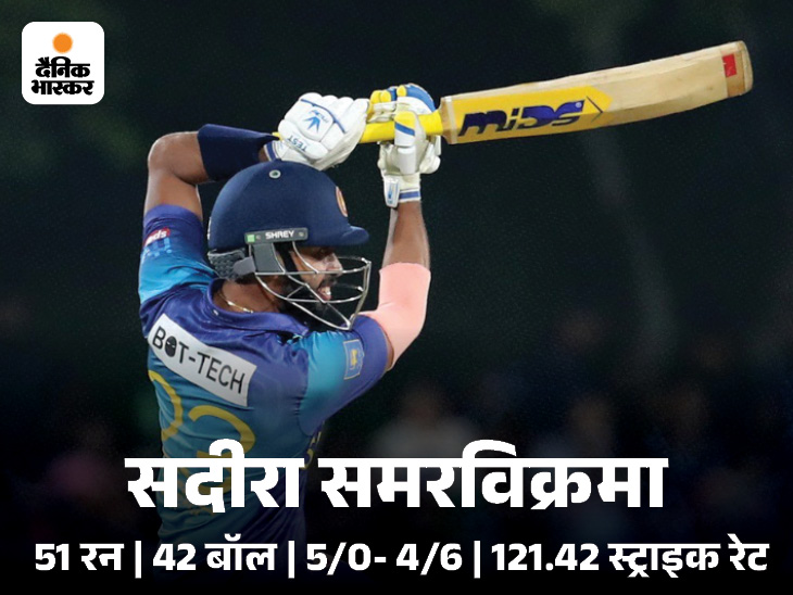 श्रीलंका ने शुरुआत से अटैकिंग अप्रोच रखी। ओपनिंग करने उतरे पथुम निसांका ने 11 बॉल में 25 रन और कुसल मेंडिस ने 14बॉल में 23 रन बनाए। वहीं, तीसरे विकेट के लिए धनंजय सिल्वा 14 रन बना कर आउट हुए। चौथे नंबर पर आए सदीरा समरविक्रमा एक छोर पर टिके रहे। वहीं, कप्तान वानिंदु हसरंगा 22 रन और चरिथ असलंका 4 रन बना कर आउट हुए।