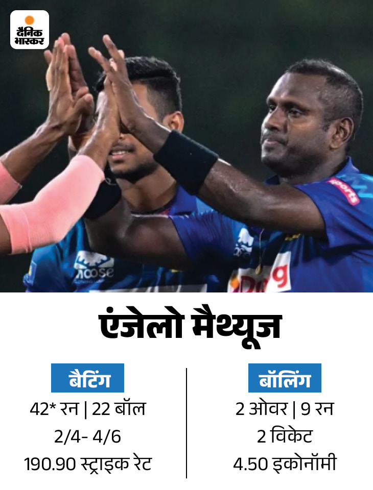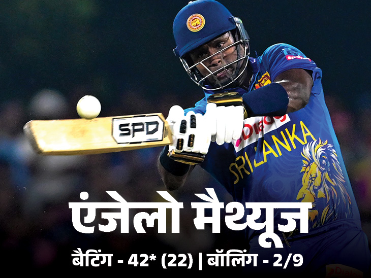 श्रीलंका के एंजेलो मैथ्यूज ने शानदार प्रदर्शन किया। बल्लेबाजी में उन्होंने नाबाद रहते 22 बॉल में 42 रन बनाए। वहीं, गेंद से 2 विकेट लिए।