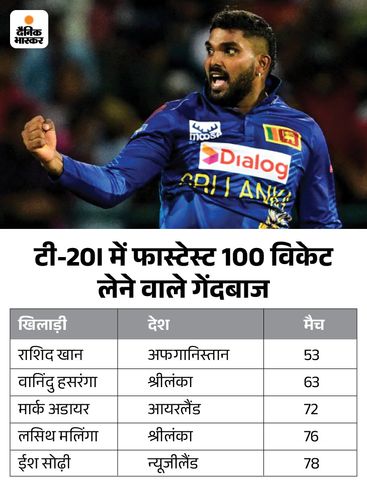 वानिंदु हसरंगा ने इंटरनेशनल टी-20 में 100 विकेट पूरे हो गए है। वे 100 विकेट लेने वाले 11वें गेंदबाज और दूसरे श्रीलंकाई गेंदबाज बन गए हैं। इससे पहले लसिथ मलिंगा 100 विकेट ले चुके हैं। अफगानिस्तान के राशिद खान के बाद हसरंगा 100 विकेट लेने वाले फास्टेस्टप्लेयर भी बन गए है।
