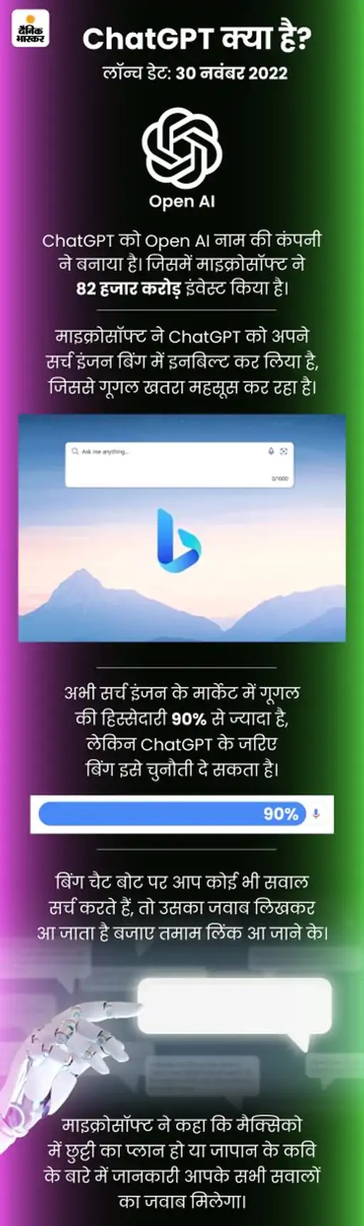 AI की दुनिया में फिलहाल माइक्रोसॉफ्ट के बड़े निवेश वाली कंपनी OpenAI का ChatGPT सबसे आगे है। चैटजीपीटी को पिछले साल 30 नवंबर को लॉन्च किया गया था और एक महीने के भीतर इसके यूजर्स की संख्या दस करोड़ को पार कर गई थी। गूगल का चैटबॉट बार्ड LaMDA के लार्ज लैंग्वेज मॉडल पर बेस्ड है।