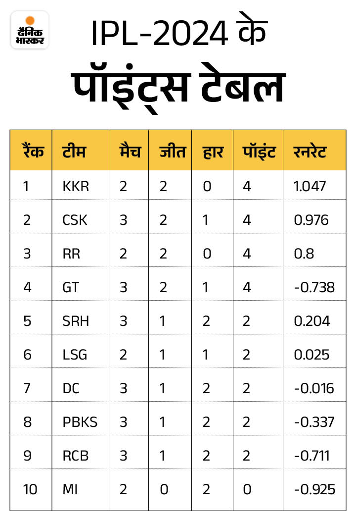 IPL 2024 में 13 मैच पूरे हो चुके हैं। रविवार शाम विशाखापट्टनम के मैदान पर चैन्नई सुपर किंग्स को सीजन की पहली हार मिली। टीम को दिल्ली कैपिटल्स ने 20 रन से हराया। इसी हार के साथ चेन्नई सुपर किंग्स को 3 मैचों में 2 जीत के साथ 4 पॉइंट ही है। टीम पॉइंट्स टेबल में दूसरे नंबर पर है। बेहतर रनरेट के साथ कोलकाता नाइट राइडर्स (KKR) 4 पॉइंट्स के साथ टॉप पर बना हुआ है। KKR ने अपने दोनों शुरुआती मैच जीते।