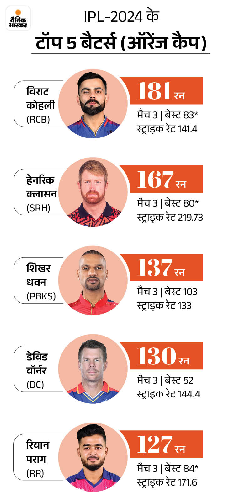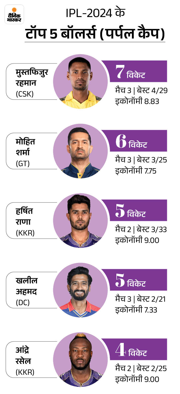 CSK के लिए DC के खिलाफ मुस्तफिजुर रहमान ने एक विकेट लिया। कुल 7 विकेट के साथ वे पर्पल कैप होल्डर हैं। वहीं, RCB के ओपनर विराट कोहली के नाम सबसे रन है, उनके पास ऑरेंज कैप है।