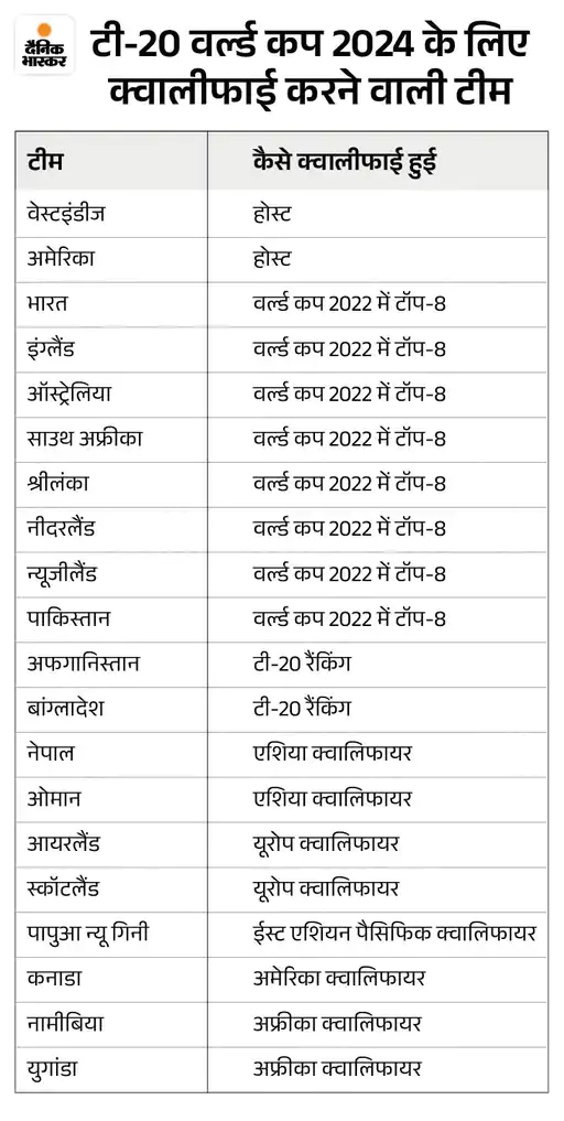 टी-20 वर्ल्ड कप में 20 टीमों को 5-5 के 4 ग्रुप में बांटा जाएगा। ग्रुप स्टेज में 40 मैच होंगे। सभी ग्रुप की 2-2 टॉप टीमें सुपर-8 स्टेज में पहुंचेंगी, इस स्टेज में 12 मैच होंगे। सुपर-8 की भी 2-2 टॉप टीमें सेमीफाइनल में क्वालिफाई करेंगी। सेमीफाइनल की विजेता टीमों के बीच 30 जून 2024 को टूर्नामेंट का फाइनल खेला जाएगा। 2 सेमीफाइनल, एक फाइनल और 52 ग्रुप स्टेज मैच मिलाकर टूर्नामेंट में 27 दिन के अंदर कुल 55 मैच खेले जाएंगे।