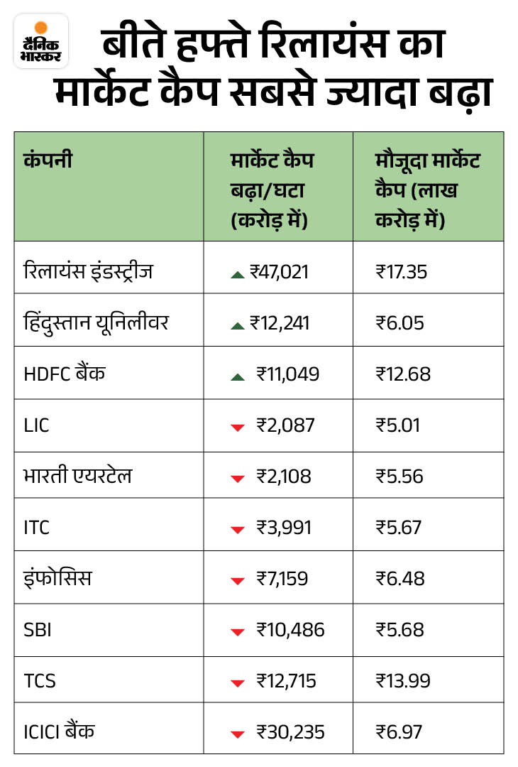 हालांकि, रिलायंस इंडस्ट्रीज का मार्केट कैप बीते हफ्ते ₹47,021.59 करोड़ बढ़कर ₹17.35 लाख करोड़ हो गया। हिंदुस्तान यूनिलीवर का भी मार्केट कैप इस दौरान ₹12,241.37 करोड़ बढ़कर ₹6.05 लाख करोड़ और HDFC बैंक का मार्केट कैप ₹11,049.74 करोड़ बढ़कर ₹12.68 लाख करोड़ हो गया।