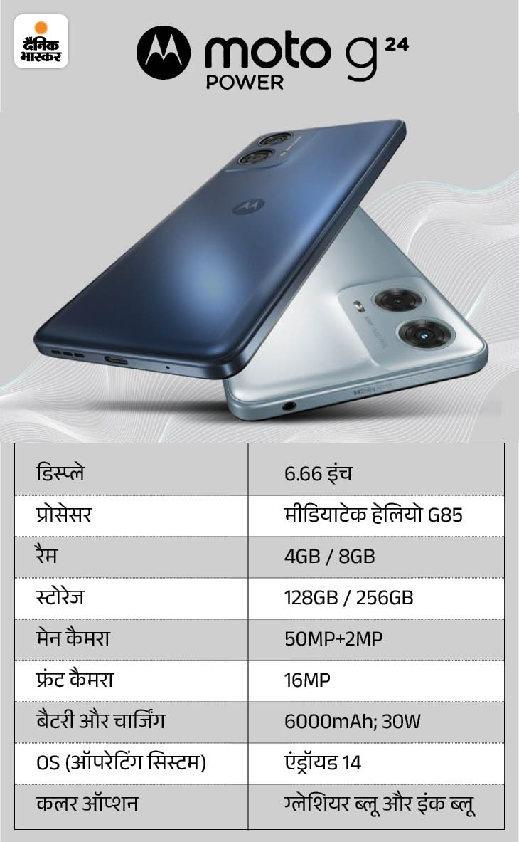 कैमरा: फोटोग्राफी और वीडियो रिकॉर्डिंग के लिए मोटो G24 पावर स्मार्टफोन के बैक पैनल पर डुअल कैमरा सेटअप में 50MP+2MP का क्वाड पिक्सल कैमरा दिया गया है। वहीं, सेल्फी और विडियो कॉलिंग के लिए फोन में 16MP का फ्रंट कैमरा कंपनी ने दिया है। स्मार्टफोन के कैमरे मैक्रो-विजन और नाइट विजन के साथ आएंगे।
