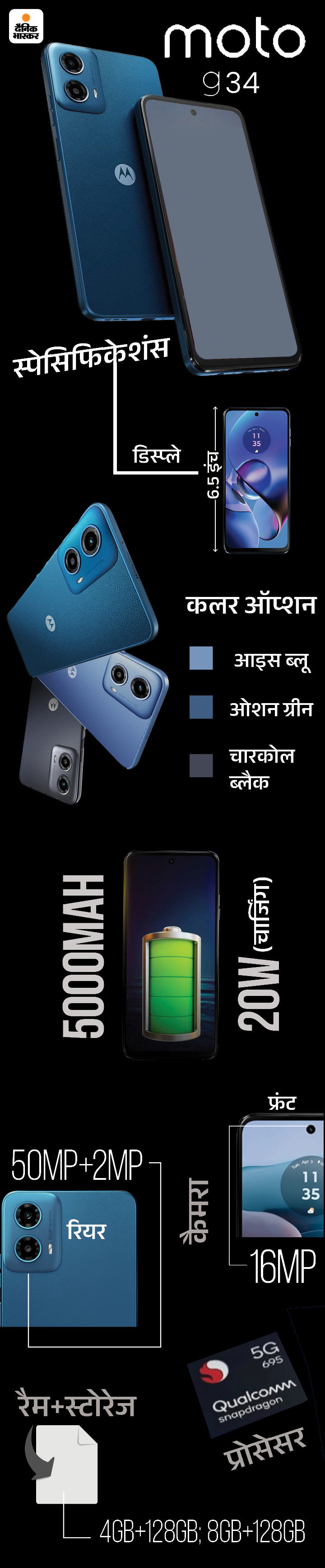 प्रोसेसर: परफॉर्मेंस के लिए मोटो G34 5G में स्नैपड्रैगन 695 प्रोसेसर कंपनी ने दिया है। कंपनी का दावा है कि यह अपने सेगमेंट का फास्टेस्ट 5G परफॉर्मिंग स्मार्टफोन होगा।