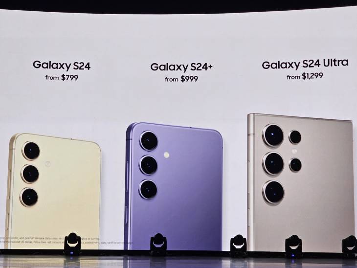 सैमसंग गैलेक्सी S24 अल्ट्रा को नई फ्लैट स्क्रीन और फ्लैट कॉर्नर के साथ लॉन्च किया गया। गैलेक्सी S24 अल्ट्रा की कीमत अमेरिकी बाजार में 1,300 डॉलर (लगभग 1,08,000 रुपए) रखी गई है। इसके साथ ही सैमसंग गैलेक्सी S24 स्मार्टफोन 799 डॉलर और सैमसंग गैलेक्सी S24 प्लस स्मार्टफोन 999 डॉलर भी पेश किए गए।
