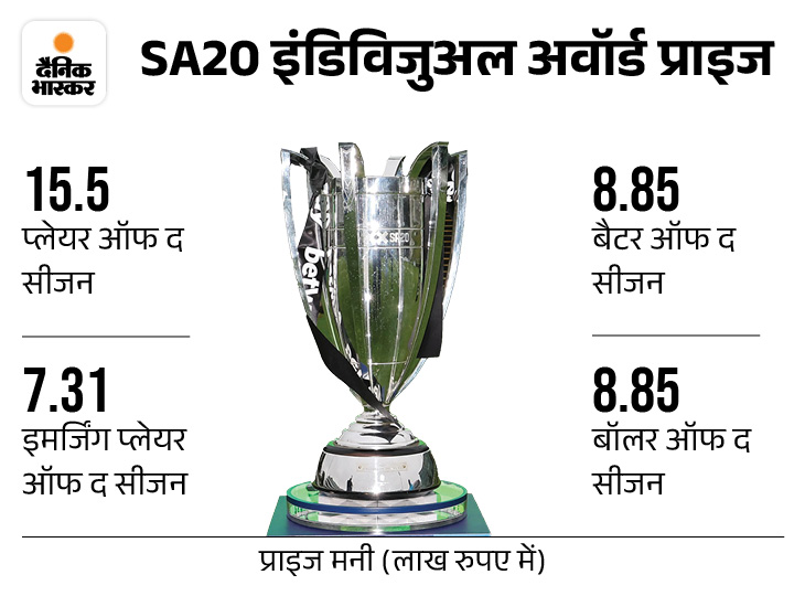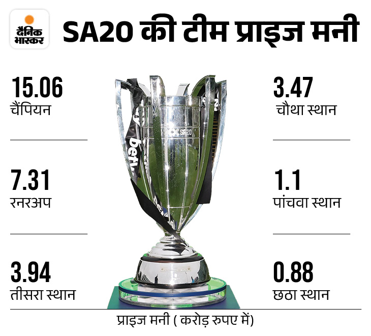 साउथ अफ्रीका की फ्रैंचाइज लीग SA20 की प्राइज मनी का ऐलान कर दिया गया है। लीग की विनर टीम को 15 करोड़ रुपए मिलेंगे, जबकि उपविजेता को 7.3 करोड़ रुपए से संतोष करना होगा। लीग के मौजूदा सीजन में कुल 31 करोड़ रुपए की प्राइज मनी बांटी जाएगी।